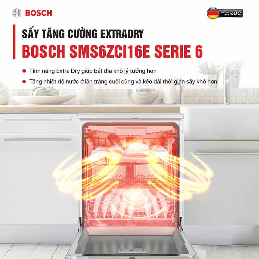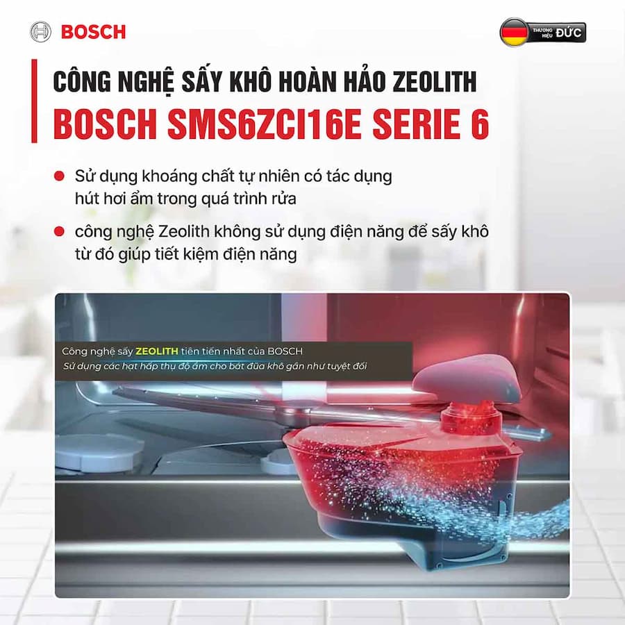 SMS6ZCI16E sử dụng hệ thống sấy Zeolith độc quyền của Bosch , được bổ sung bởi bộ trao đổi nhiệt.