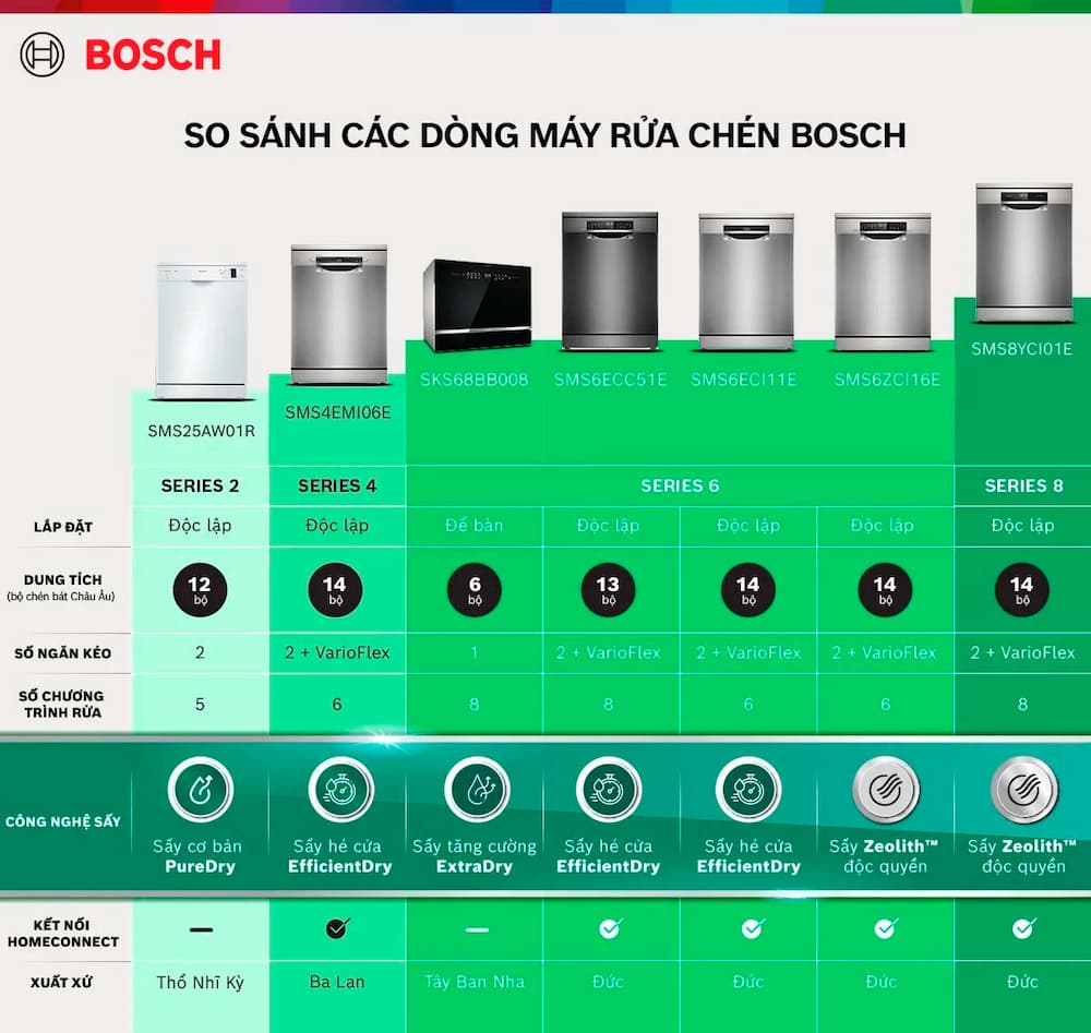 Máy rửa bát độc lập Bosch SMS6ZCI16E đại diện cho một bước tiến đáng kể trong lĩnh vực máy rửa bát độc lập, đặt ra một tiêu chuẩn cao về hiệu quả, độ êm ái và chức năng thông minh trong phân khúc của nó. Sự kết hợp giữa công nghệ sấy tiên tiến, các chương trình thích ứng và chất lượng chế tạo mạnh mẽ biện minh cho vị thế cao cấp của máy. Mặc dù mức giá của máy cao hơn một số lựa chọn thay thế, nhưng khoản tiết kiệm lâu dài về tiện ích, sự tiện lợi nâng cao và sự an tâm từ sự đảm bảo thương hiệu của Bosch khiến nó trở thành một khoản đầu tư rất hấp dẫn và có giá trị cho người tiêu dùng khó tính. Hiệu suất vượt trội của model so với ngay cả các mẫu Series 6 khác nhấn mạnh sự đổi mới liên tục của Bosch và cam kết cung cấp các thiết bị gia dụng tiên tiến.