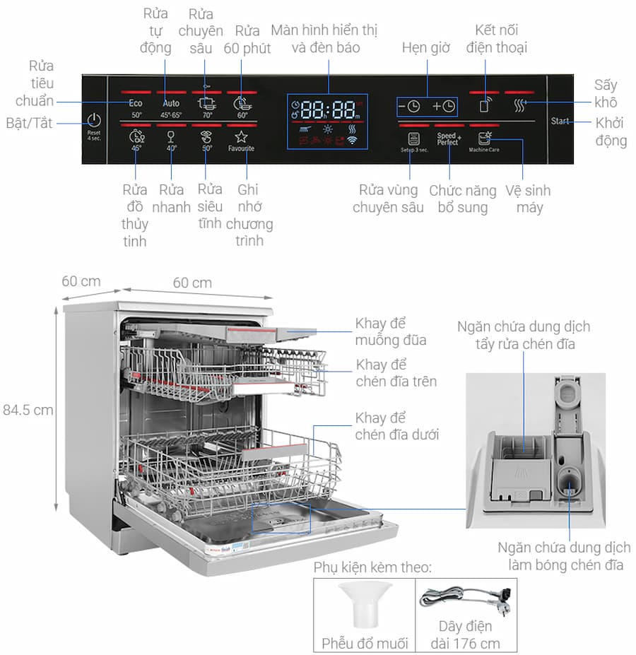 Yêu cầu chất tẩy rửa chuyên dụng: Cần sử dụng viên rửa/bột rửa, muối và nước làm bóng chuyên dụng cho máy rửa bát để đạt hiệu quả tốt nhất và bảo vệ máy.