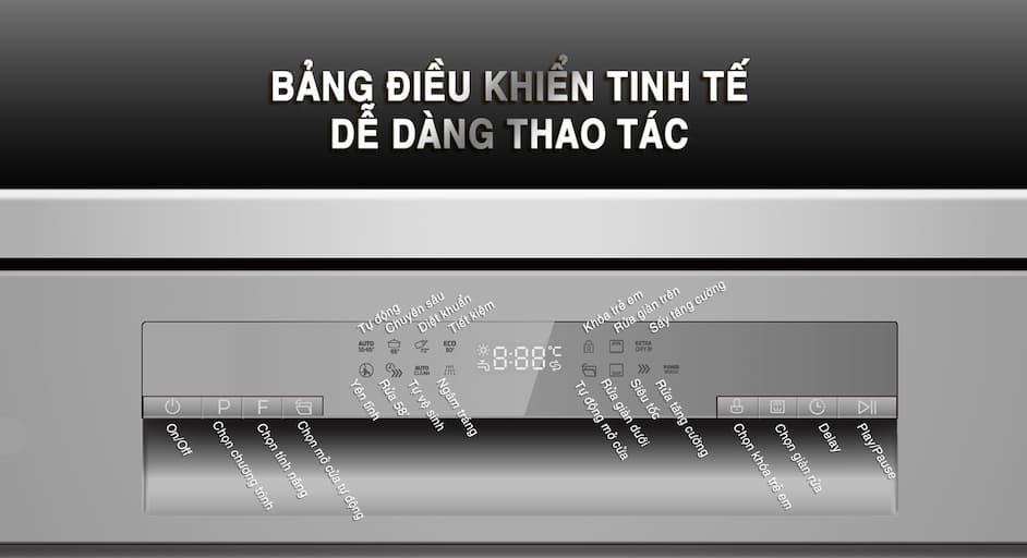 7 Tính năng tăng cường: Bao gồm tự động mở cửa , sấy tăng cường 30%, rửa tăng cường, rửa siêu tốc, hẹn trờ trễ và khóa trẻ em để đảm bảo an toàn khi sử dụng.