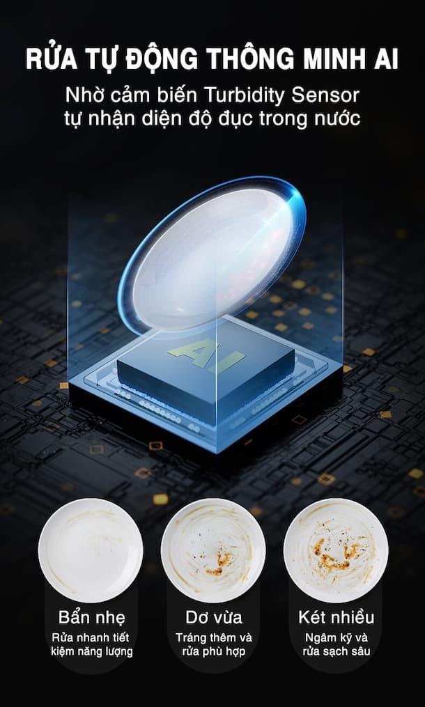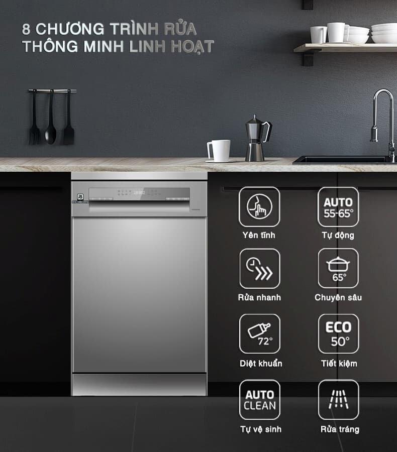 8 Chương trình rửa: Bao gồm rửa thông minh AI, rửa chuyên sâu, rửa diệt khuẩn, rửa sinh thái, rửa hàng ngày và ngâm tráng. Mỗi chế độ được thiết kế để đáp ứng nhu cầu rửa sạch đồ dùng trong mọi tình huống