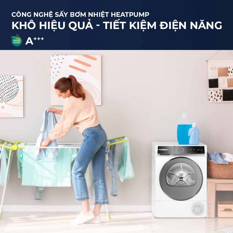 Công nghệ bơm nhiệt (Heat Pump): Đây là công nghệ sấy tiên tiến nhất hiện nay, giúp sấy khô quần áo ở nhiệt độ thấp hơn, bảo vệ sợi vải tốt hơn, giảm nhăn và đặc biệt là cực kỳ tiết kiệm điện năng (đạt nhãn năng lượng A+++ theo tiêu chuẩn châu Âu).