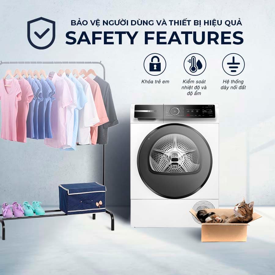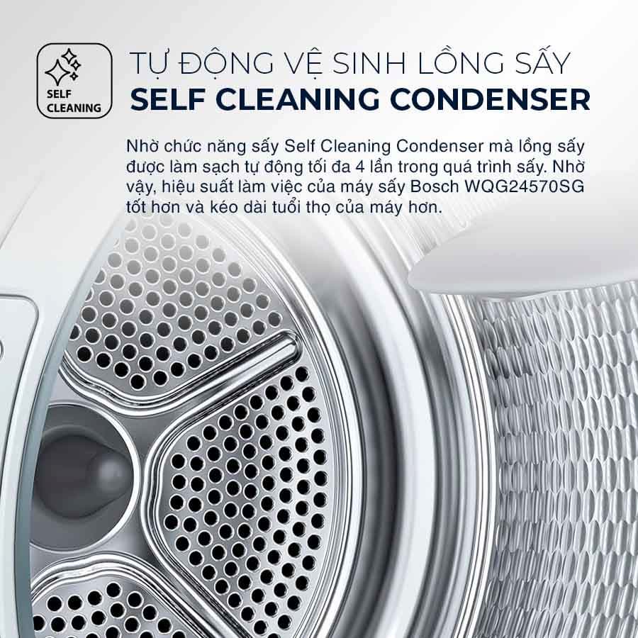 Tự động làm sạch bình ngưng (SelfCleaning Condenser): Đây là một tính năng rất được đánh giá cao. Bình ngưng sẽ tự động được làm sạch tới 4 lần trong quá trình sấy, giúp duy trì hiệu suất năng lượng tối ưu của máy và giảm thiểu công việc vệ sinh thủ công cho người dùng.