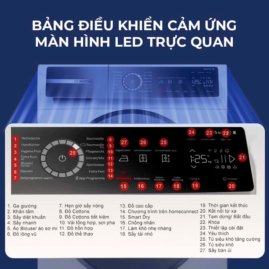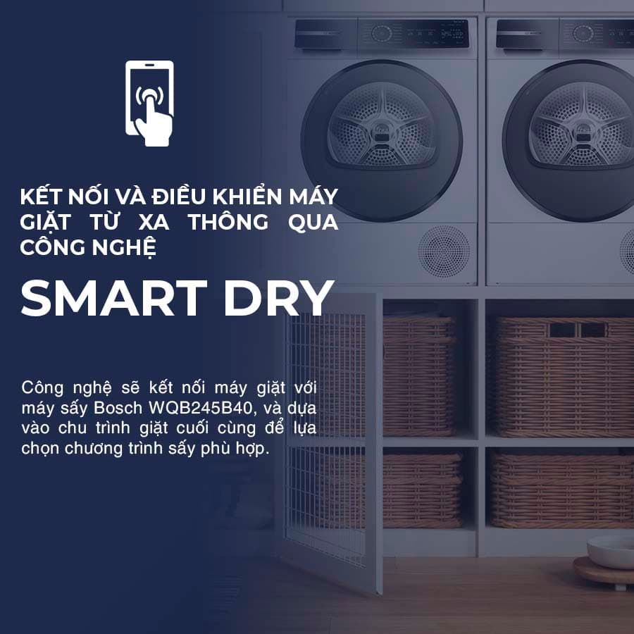 SmartDry: Máy sấy có khả năng giao tiếp không dây với máy giặt Bosch tương thích, tự động chọn chương trình sấy tối ưu dựa trên chu trình giặt cuối cùng.