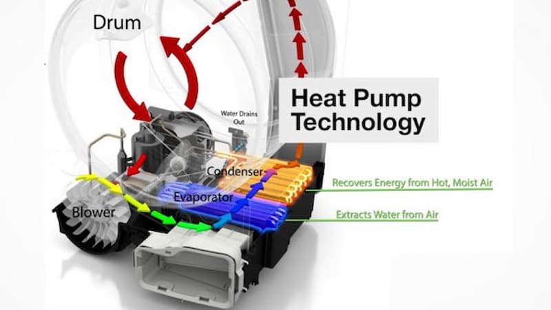 Công nghệ sấy Heat Pump (Bơm nhiệt): Đây là công nghệ sấy tiên tiến nhất hiện nay, sử dụng khí nóng để làm khô quần áo thay vì dùng điện trở thông thường. Điều này giúp giảm đáng kể lượng điện năng tiêu thụ (tiết kiệm đến 50% so với máy sấy truyền thống), bảo vệ sợi vải tốt hơn nhờ nhiệt độ sấy thấp và ổn định, đặc biệt phù hợp với các loại vải nhạy cảm. Máy đạt nhãn năng lượng A++ (theo thang đo từ A+++ đến D).