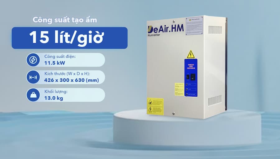 Hiệu suất tạo ẩm cao: Công suất tạo ẩm lên đến 15 kg/giờ, đáp ứng nhu cầu làm ẩm nhanh chóng cho các không gian rộng.
