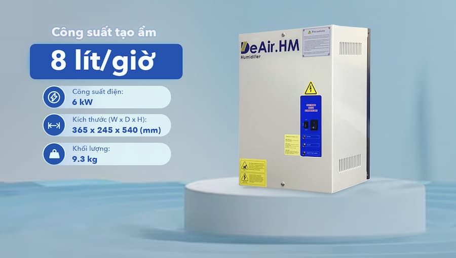 Công suất tạo ẩm: 8 kg/h (tương đương 8 lít hơi nước mỗi giờ).
