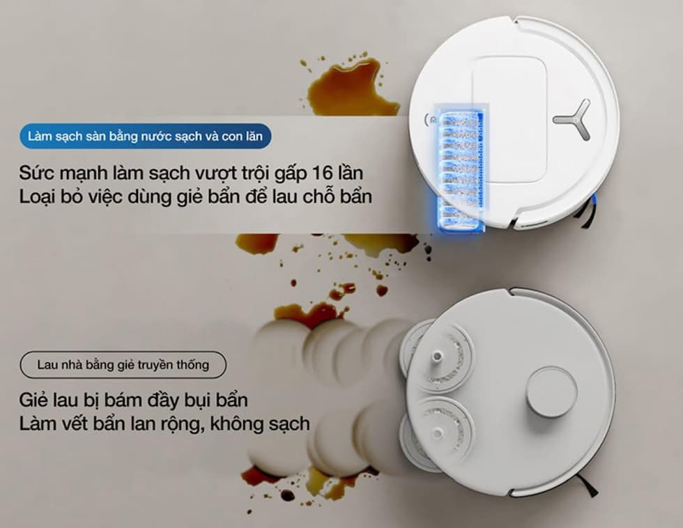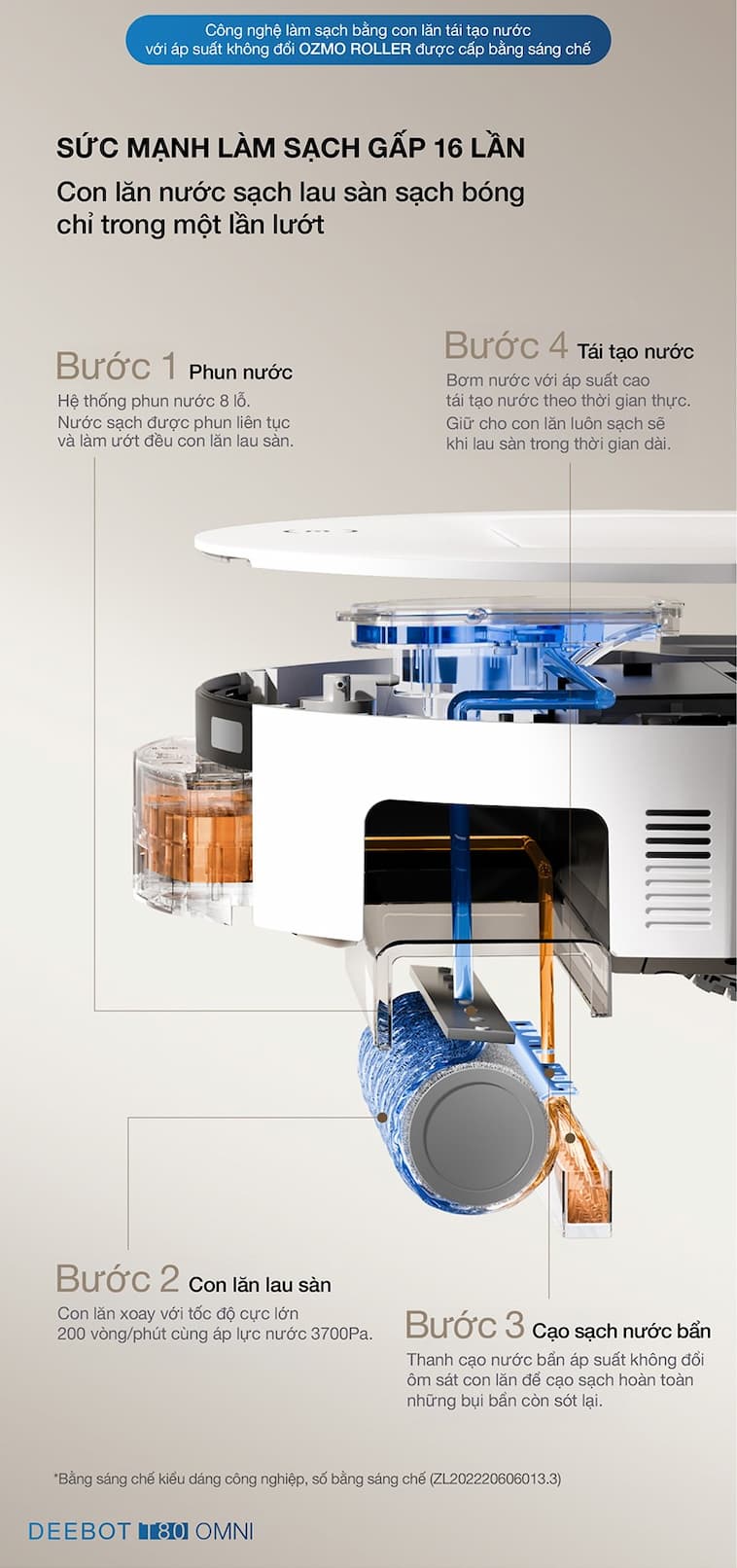 Được tích hợp trên robot hút bụi cao cấp, Ecovacs Deebot T80 Omni trở thành robot cao cấp sở hữu công nghệ tái tạo nước áp suất không đổi OZMO Roller - Sự khác biệt tạo nên hiệu quả đột phá: Làm sạch sâu vượt trội: Khác biệt hoàn toàn so với các phương pháp lau truyền thống, OZMO Roller sử dụng con lăn xoay liên tục, tạo ra áp lực mạnh mẽ giúp đánh bay mọi vết bẩn cứng đầu, từ bụi mịn đến các vết ố bám dính. Hệ thống tái tạo nước sạch ưu việt: Khăn lau đi qua bộ phận cạo ở mỗi cuộn để loại bỏ bụi & nước bẩn. Sau đó được làm sạch và cấp ẩm qua 16 vòi phun nhỏ với tốc độ tới 200 lần/phút. Điều này không chỉ loại bỏ các vệt nước, mà còn ngăn ngừa tối đa tình trạng nhiễm khuẩn chéo cho sàn nhà.