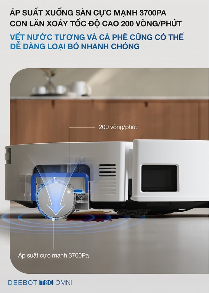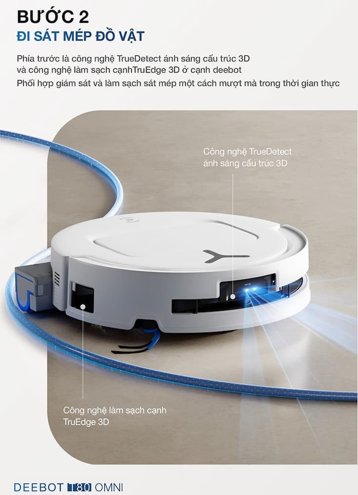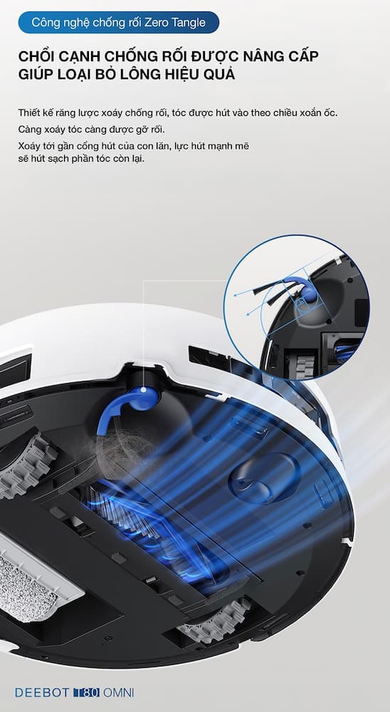 Được trình làng tại Triển lãm Thiết bị Điện tử & Gia dụng Thế giới AWE 2025 (Thượng Hải, Trung Quốc), Deebot T80 Omni nổi bật với loạt công nghệ ấn tượng. Công nghệ lau nhà OZMO ROLLER, trước đây chỉ có trên dòng X cao cấp. Đặc biệt, công nghệ này còn cho khả năng lau nhà tự làm sạch ngay lập tức, mang đến trải nghiệm lau nhà mạnh mẽ hơn với áp lực tác động lên sàn nhà lên tới 3.700Pa, mạnh gấp hơn 16 lần. Robot hút bụi lau nhà Ecovacs Deebot T80 Omni thiết kế mỏng chỉ 98 mm, dễ dàng vệ sinh gầm tủ, ghế sofa, dọn sạch khu vực gầm thấp. Công nghệ ZeroTangle 3.0, với cấu trúc chổi chính 3 hình chữ V nghiêng 45°, một thiết kế thông minh giúp ngăn chặn tóc bị mắc kẹt. Chổi cạnh ARClean Ecovacs Deebot T80 Omni với thiết kế răng lược xoáy chống rối, càng xoáy lông/tóc sẽ càng dễ gỡ rối và được đưa đến gần cổng hút để hút sạch.