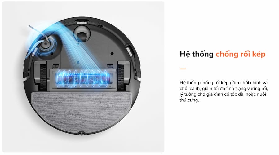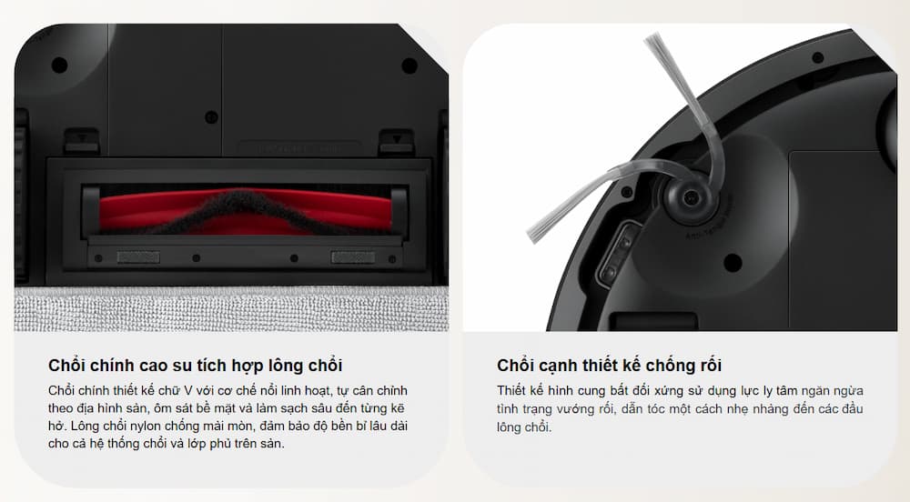 Hệ thống chống rối kép: Hệ thống chống rối kép gồm chổi chính và chổi cạnh, giảm tối đa tình trạng vướng rối