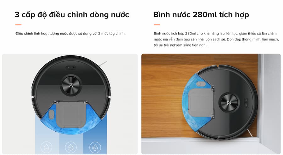3 cấp độ điều chỉnh dòng nước và bình nước 280ml tích hợp cho phép robot hoạt động liên tục, giảm số lần tiếp nước, tối ưu hiệu suất làm sạch không gián đoạn