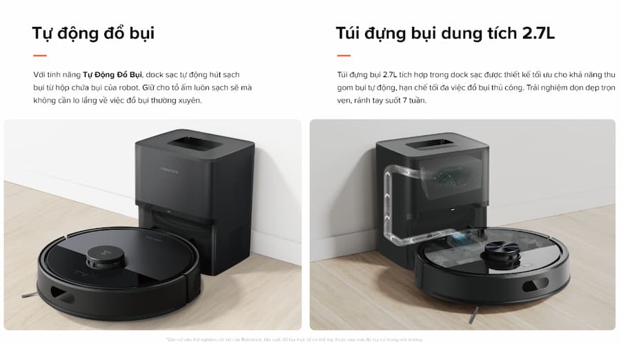 Dock sạc có tính năng tự động hút bụi từ robot vào túi đựng bụi 2,7L, mang đến trải nghiệm dọn dẹp rảnh tay suốt 7 tuần