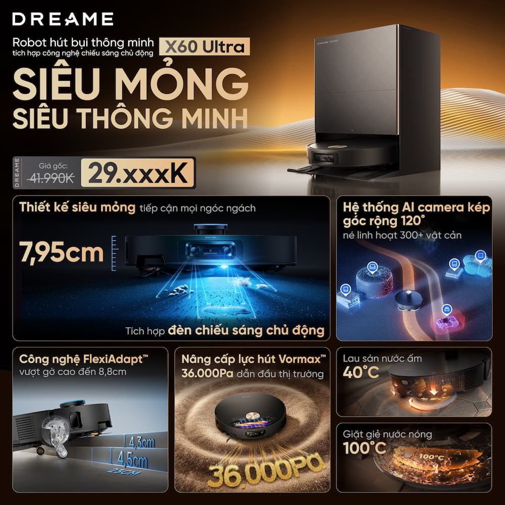 Dreame X60 Ultra là dòng robot hút bụi cao cấp nhất của Dreame (phiên bản 2026), được thiết kế để giải quyết hai bài toán lớn nhất của robot hút bụi: Chiều cao thân máy và Khả năng làm sạch thảm/vết bẩn cứng đầu. Siêu phẩm mới Dreame X60 Ultra - Robot hút bụi siêu mỏng chính thức ra mắt - xóa bỏ hoàn toàn định nghĩa "vùng cấm" trong nhà, được trang bị hàng loạt công nghệ làm sạch tiên tiến như lực hút siêu mạnh 35.000Pa, hệ thống chổi DuoBrush chống rối 100%, camera AI kép, công nghệ chiếu sáng chủ động và trạm sạc đa chức năng 10-in-1. Không chỉ nổi bật với hiệu suất làm sạch mạnh mẽ, Dreame X60 Ultra còn gây ấn tượng với thiết kế thân máy siêu mỏng chỉ 7,95cm, giúp robot dễ dàng làm sạch các khu vực gầm thấp như gầm sofa, gầm giường hoặc gầm tủ - những nơi mà robot hút bụi thông thường khó tiếp cận. Không cần trực tiếp chạm tay, chỉ cần 1 chạm với X60 Ultra - nhãn "vùng cấm" đều dễ dàng gỡ bỏ! Sở hữu ngay siêu phẩm robot hút bụi mỏng đặc biệt Dreame X60 Ultra với ưu đãi giá hấp dẫn!