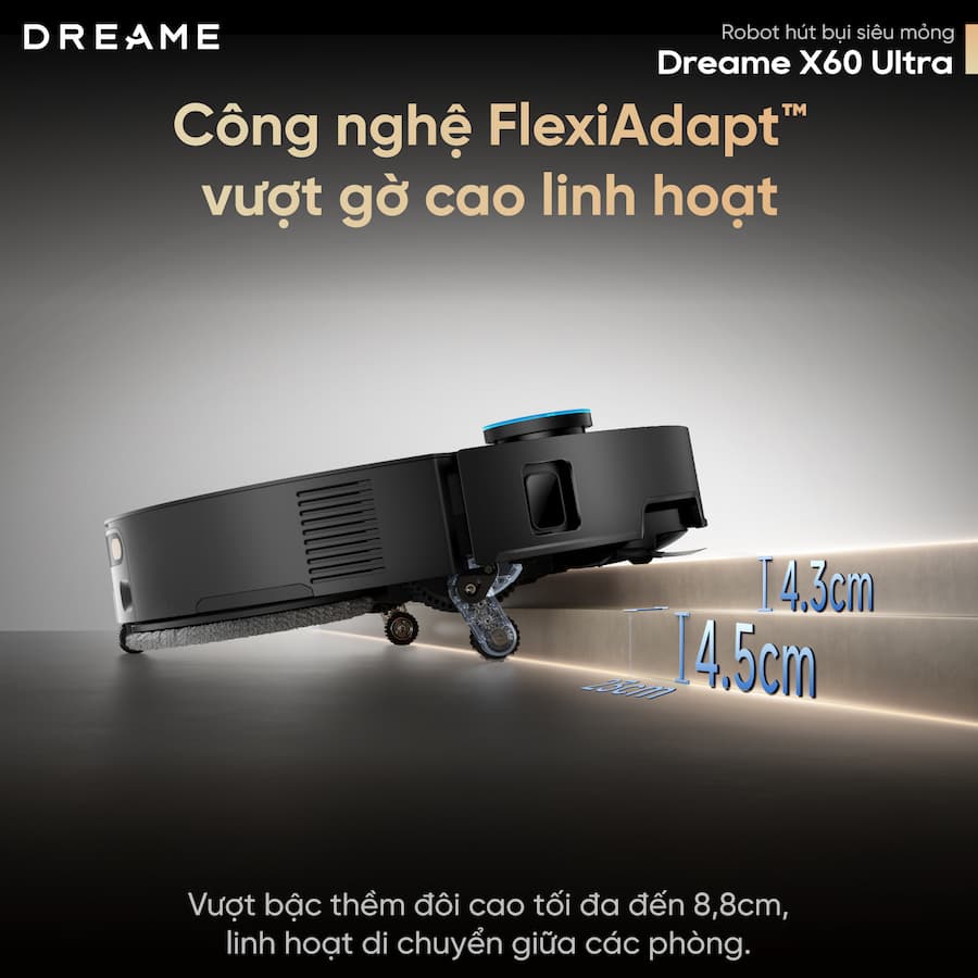 Vượt chướng ngại vật cực cao: Robot hút bụi lau sàn chuyên dụng Dreame X60 Ultra có thể tự nâng thân máy để leo qua các bậc cửa cao tới 8.8cm, giúp nó di chuyển linh hoạt giữa các phòng có thiết kế nền không đồng nhất.