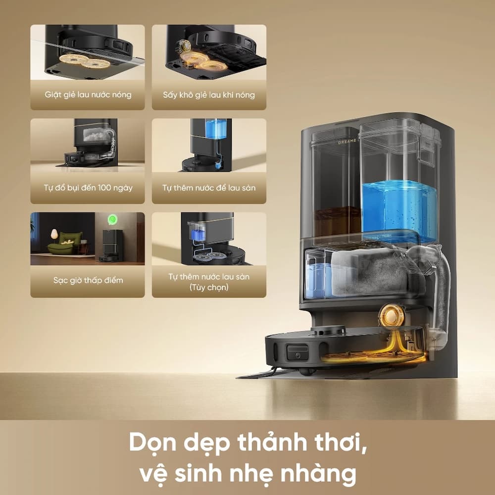 - Thoải mái tận hưởng sự tiện nghi cùng Trạm sạc toàn diện PowerDock: tự lau nước nóng, tự giặt giẻ và tự sạc pin.