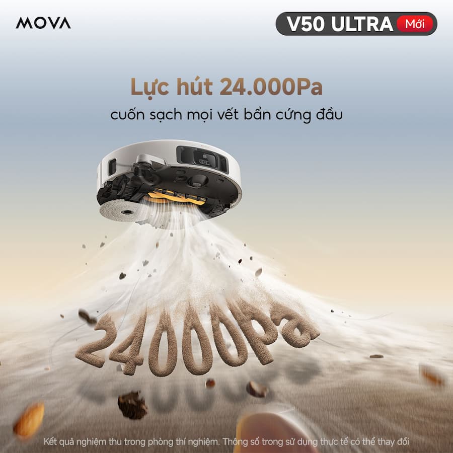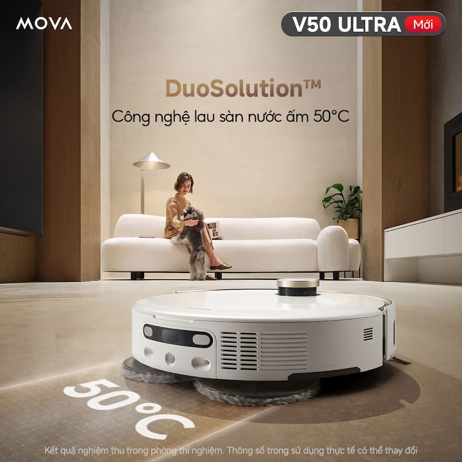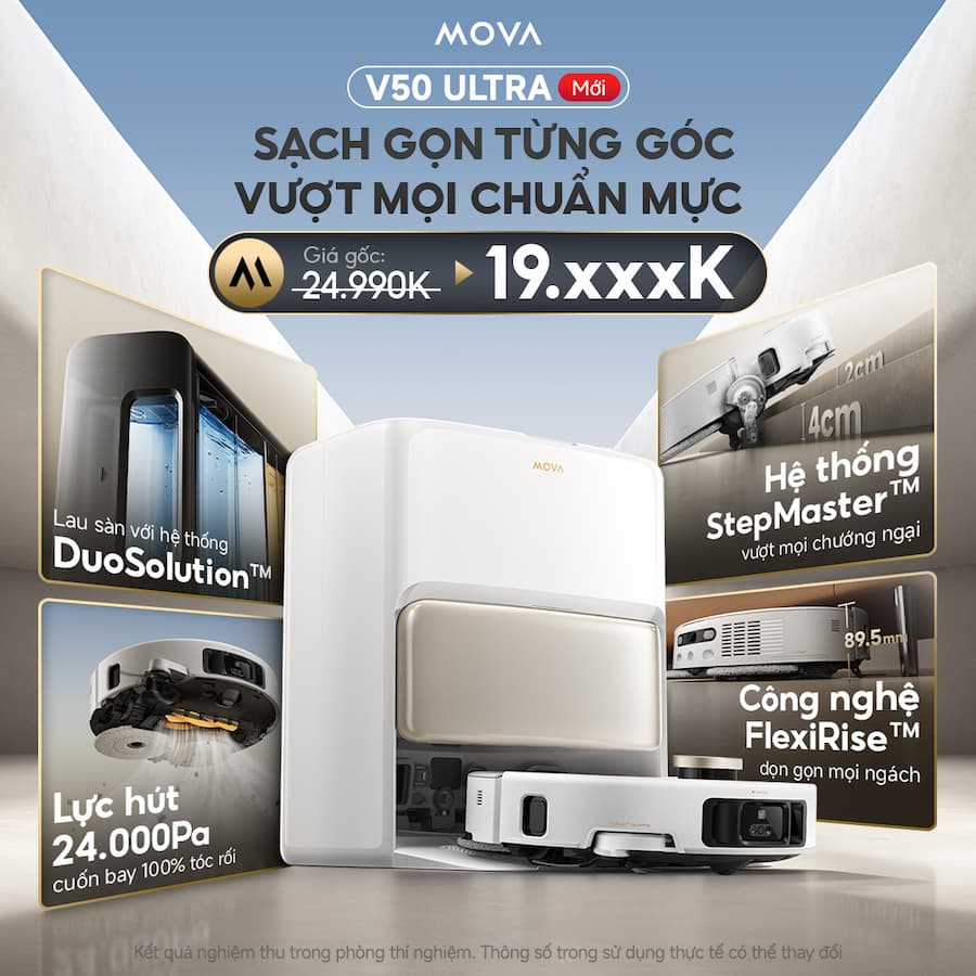 Bụi ‘ẩn nấp’ ở cạnh tường, gầm giường, tóc rối bám chổi, dầu mỡ lau mãi không sạch… những việc tưởng nhỏ lại khiến bạn vừa mệt vừa mất thời gian! Robot Hút Bụi Lau Sàn Mova V50 Ultra là một dòng robot hút bụi lau sàn cao cấp, nổi bật với nhiều công nghệ làm sạch và tính năng tự động hóa toàn diện. Gạt ngay mọi stress, Robot hút bụi công nghệ mới - Mova V50 Ultra chính thức có mặt tại Việt Nam, thay bạn làm sạch sâu từng ngóc ngách, thiết lập chuẩn mực mới cho công nghệ dọn dẹp thông minh: Công nghệ DuoSolution™ lau sàn bằng nước ấm 50°C đánh bay dầu mỡ, nước tương, cà phê chỉ với 1 lần lau. Hệ thống bánh xe StepMaster™ co duỗi linh hoạt, giúp máy vượt chướng ngại, leo bậc đến 6cm, không lo kẹt thảm hay gờ cửa. Công nghệ FlexiRise™ dễ dàng nâng hạ cảm biến dTof, giúp robot tiếp cận gầm thấp, không bỏ xót bụi dưới sofa, gầm giường, tủ. Lực hút 24.000Pa vận hành êm ái, hút sạch tóc rối, lông thú và vết bẩn cứng đầu trên sàn. Ưu đãi ra mắt hấp dẫn, số lượng có hạn, nhanh tay “rước” siêu phẩm công nghệ Mova V50 Ultra để bạn luôn nhàn, nhà luôn sạch!