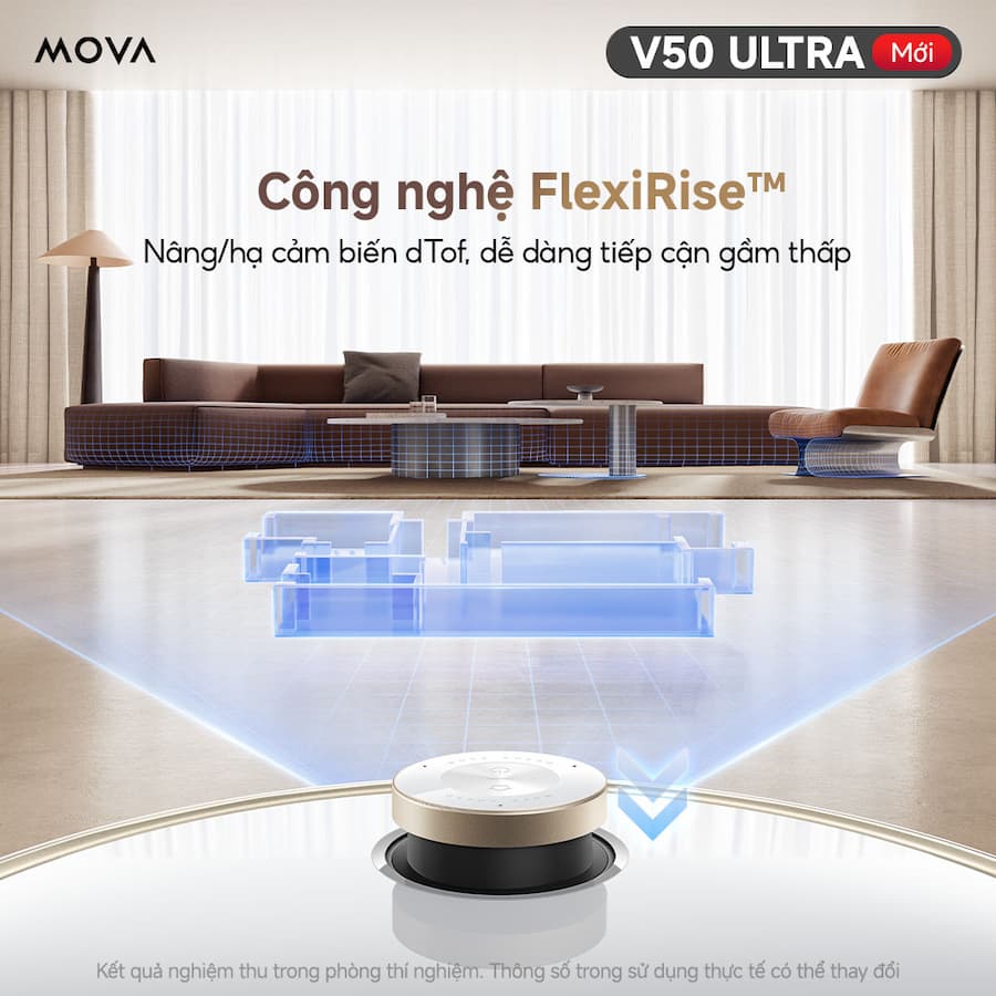Điều hướng FlexiRise™: giúp robot quan sát rõ ràng, di chuyển linh hoạt. V50 Ultra làm sạch mọi góc khuất, kể cả dưới gầm sofa, giường hay tủ nhờ cảm biến DToF thu gọn, tối ưu chiều cao, dễ dàng tiếp cận cả hành lang hẹp và gầm bếp.