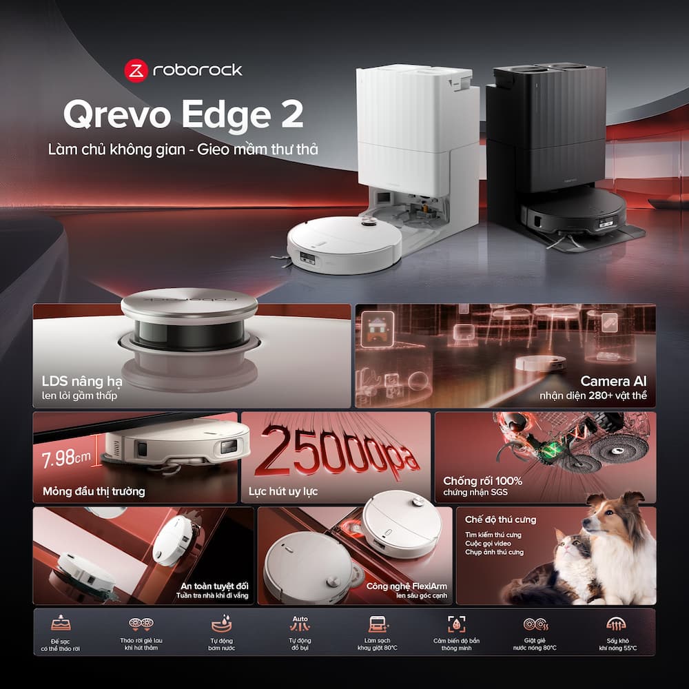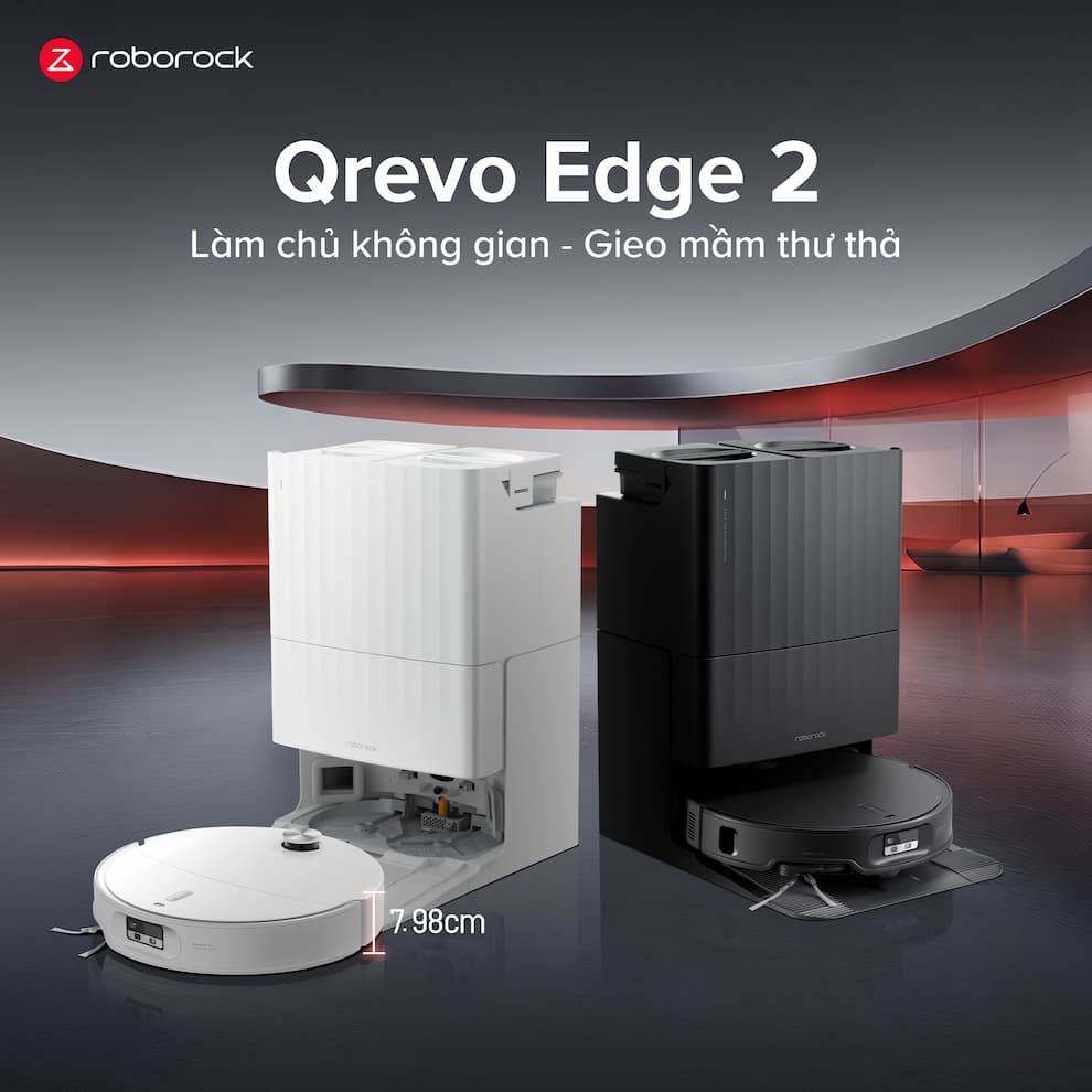 Roborock Qrevo Edge 2 là dòng robot hút bụi lau nhà cao cấp mới nhất của Roborock tính đến năm 2026, nổi bật với thiết kế siêu mỏng và lực hút mạnh nhất thị trường hiện nay. Roborock Qrevo Edge 2 nổi bật với lực hút siêu mạnh lên đến 25.000Pa, kết hợp thiết kế mỏng 7.98cm giúp dễ dàng làm sạch cả những khu vực khó tiếp cận. Sản phẩm được trang bị hệ thống LIDAR nâng hạ thông minh, tối ưu khả năng điều hướng trong mọi không gian, cùng trạm sạc đa năng có thể tự động giặt và sấy giẻ tiện lợi. Tất cả được điều khiển dễ dàng thông qua ứng dụng, mang đến trải nghiệm dọn dẹp hiện đại và hoàn toàn chủ động.