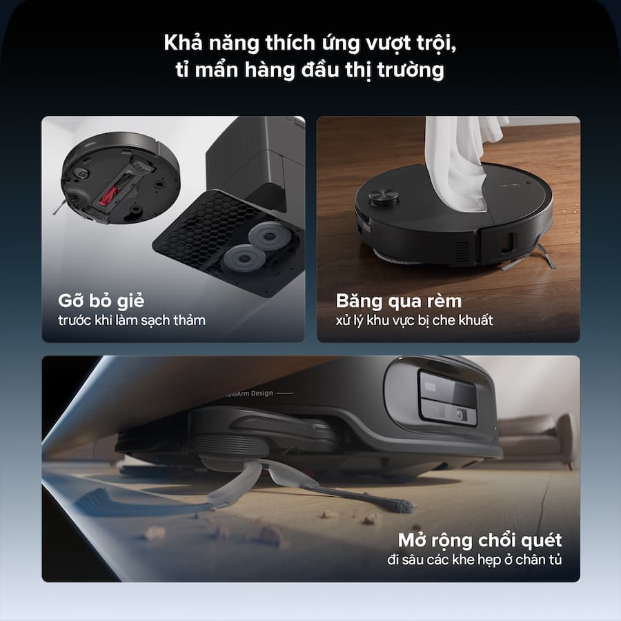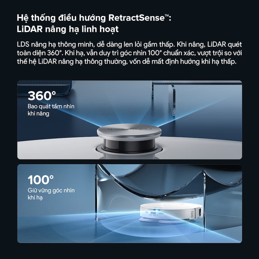 Thiết kế siêu mỏng: Thân máy chỉ dày 7,98 cm, kết hợp với hệ thống LiDAR nâng hạ linh hoạt (RetractSense) giúp robot luồn lách sâu vào các gầm tủ, giường cực thấp mà vẫn duy trì định vị chính xác.