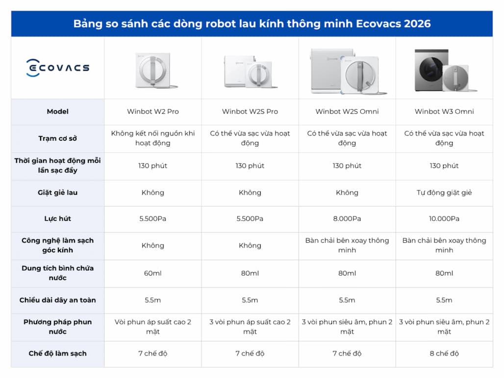 Bảng so sánh các dòng robot lau kính mới nhất đến 2026