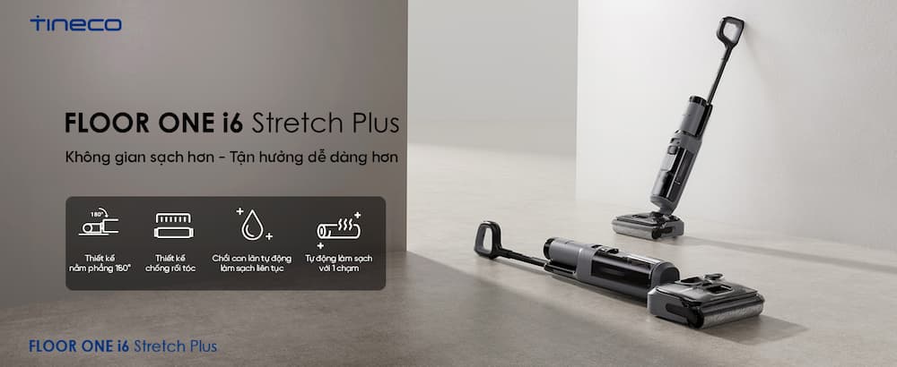 Máy hút bụi lau sàn khô ướt Tineco Floor One i6 Stretch Plus là một thiết bị dọn dẹp nhà cửa thông minh và đa năng, tích hợp nhiều công nghệ tiên tiến để vừa hút bụi, vừa lau sàn, và tự làm sạch. Với công nghệ tự làm sạch thông minh như Hệ thống tự làm sạch và sấy khô 1 chạm: Sau khi sử dụng, máy có thể tự động làm sạch con lăn bằng nước nóng và sấy khô bằng khí nóng 85°C trong khoảng 5 phút. Công nghệ chống rối độc quyền (DualBlock): Giúp xử lý hiệu quả tóc và lông thú cưng mà không lo bị kẹt hay tắc nghẽn, đảm bảo quá trình làm sạch diễn ra liên tục. Tineco Floor One i6 Stretch Plus nổi bật với nhiều tính năng cao cấp, mang lại hiệu quả làm sạch toàn diện và tiện lợi tối đa cho người dùng. Dưới đây là những điểm nổi bật nhất của sản phẩm: