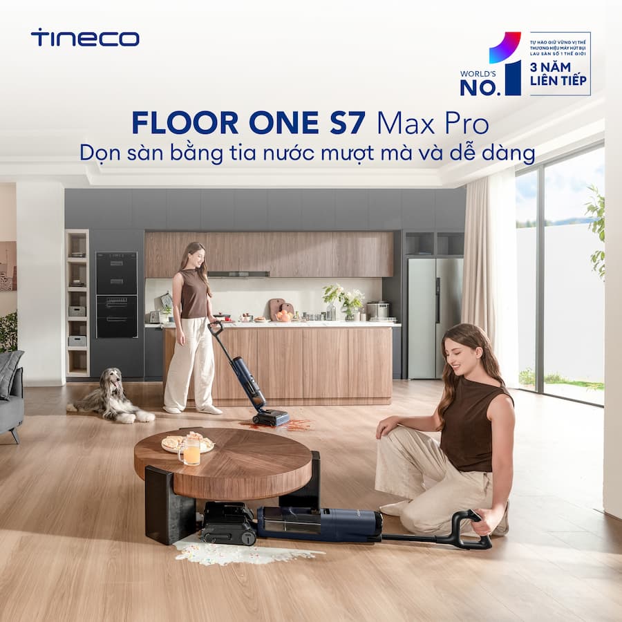 Tineco FLOOR ONE S7 Max Pro là máy hút bụi lau sàn khô ướt cao cấp, phù hợp cho gia đình hiện đại. Sản phẩm kết hợp hút bụi mạnh và lau sàn thông minh trong một thiết bị. Nhờ đó, việc vệ sinh sàn nhà trở nên nhanh chóng và nhẹ nhàng hơn mỗi ngày. Máy hút bụi lau sàn khô ướt Tineco FLOOR ONE S7 Max Pro mang đến trải nghiệm làm sạch vượt trội, mạnh mẽ và chuẩn xác trong từng bước. Công nghệ tia nước áp suất cao HydroBurst độc quyền, giúp loại bỏ hiệu quả cả những vết bẩn cứng đầu và vết bẩn khô trên sàn nhà. Nhằm đảm bảo sàn luôn sạch bóng, lưỡi gạt cao su StreakFree sẽ tự động điều chỉnh lực đẩy và thu vào để vét sạch mọi vết bẩn và vệt nước còn sót lại.
