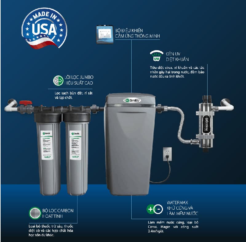Hệ thống lọc nước đầu nguồn cho gia đình của Ao Smith được trang bị khá gọn nhẹ, một hệ thống lõi lọc 2 tầng, 1 hệ thống làm mềm nước, 1 hệ thống khử vi khuẩn bằng tia UV. Đối với những dòng lọc nước đầu nguồn tốc độ xử lí nước luôn ở mức rất cao để có thẻ đáp ứng nước cho cả một toàn nhà thì hiệu suất của hệ thống lọc nước đầu nguồn vô cùng mạnh mẽ. Sức mạnh của dòng máy lọc nước Ao Smith là có đầy đủ các quá trình làm sạch và xử lý nước một cách triệt để, với yêu cầu đảm bảo hệ thống nước cấp cho toàn bộ nhà luôn đầy đủ và không lo các vấn đề chất lượng nước.
