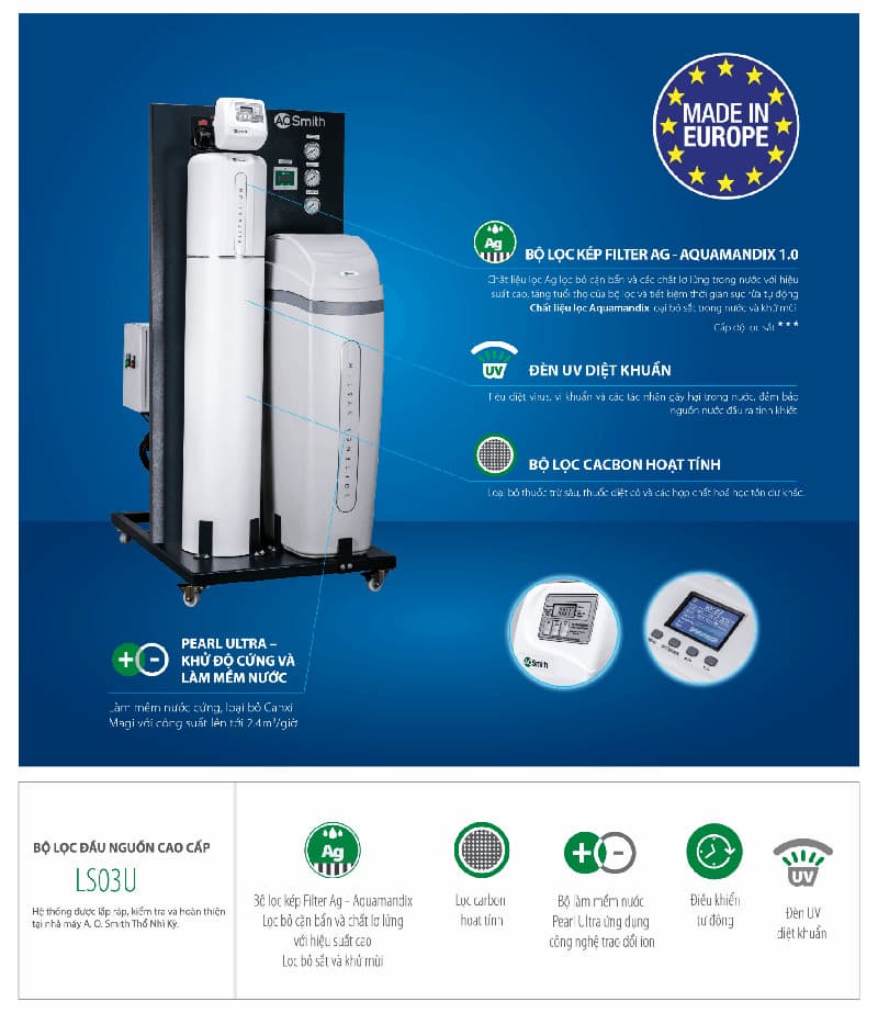Một phiên bản cao cấp dành cho các khu biệt thự hay các khách sạn, hệ thống lọc đầu nguồn AO Smith LS03U một trong những phân khúc cao cấp dành cho các gia đình biệt thự có tư 5->10 tầng, với hệ thống lọc nước hiệu suất cao từ 2.4 m3/h có thể đáp ứng đủ nhu cầu cho cả gia đình sinh hoạt trong một toàn biệt thự nhiều tầng.